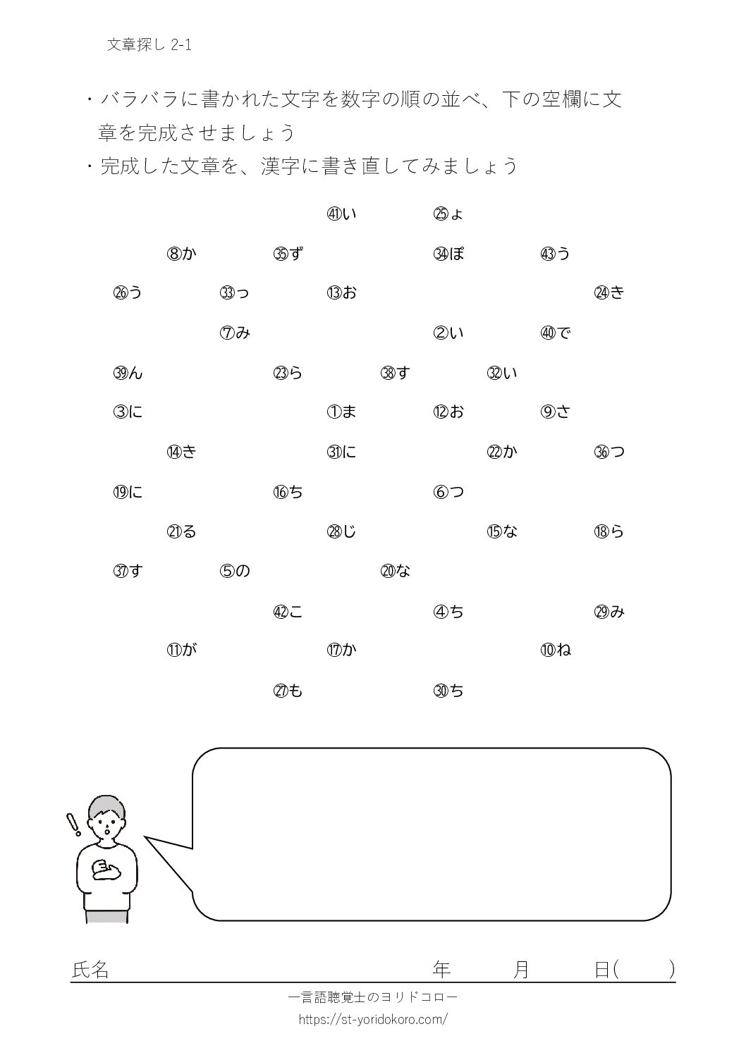 高次脳機能課題 数字順文章探し課題 【無料リハビリプリント配布中!】注意機能(持続・選択・分配・転換・同時注意)、集中力、書字能力の向上に。数字の順にひらがなを並べて書いていくと、最後には意味のある文章が完成するTMTの応用編のような課題です。 2025.10.01 高次脳機能課題