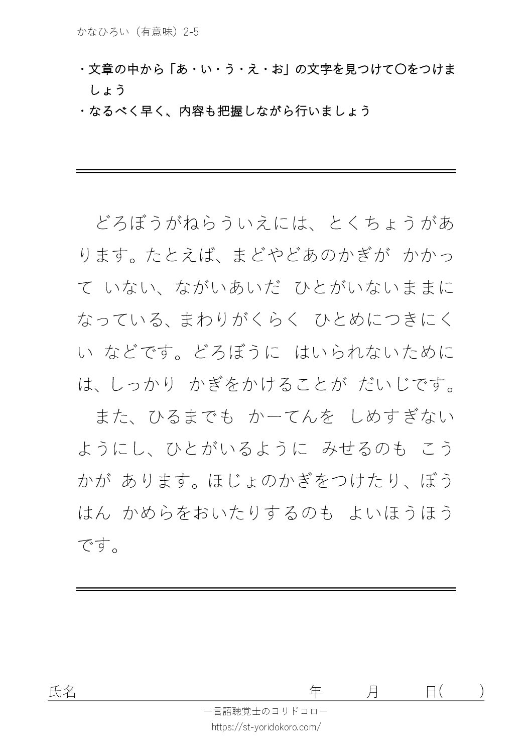 高次脳機能課題 かなひろい課題(200~250文字程度) 【注意機能無料プリント】かなひろいテストの練習ができるプリントです。注意機能(持続・選択・分配・同時注意・マルチタスク・ダブルタスク)の向上や認知症予防のアクティビティとしてもご活用いただけます。 2025.09.29 高次脳機能課題