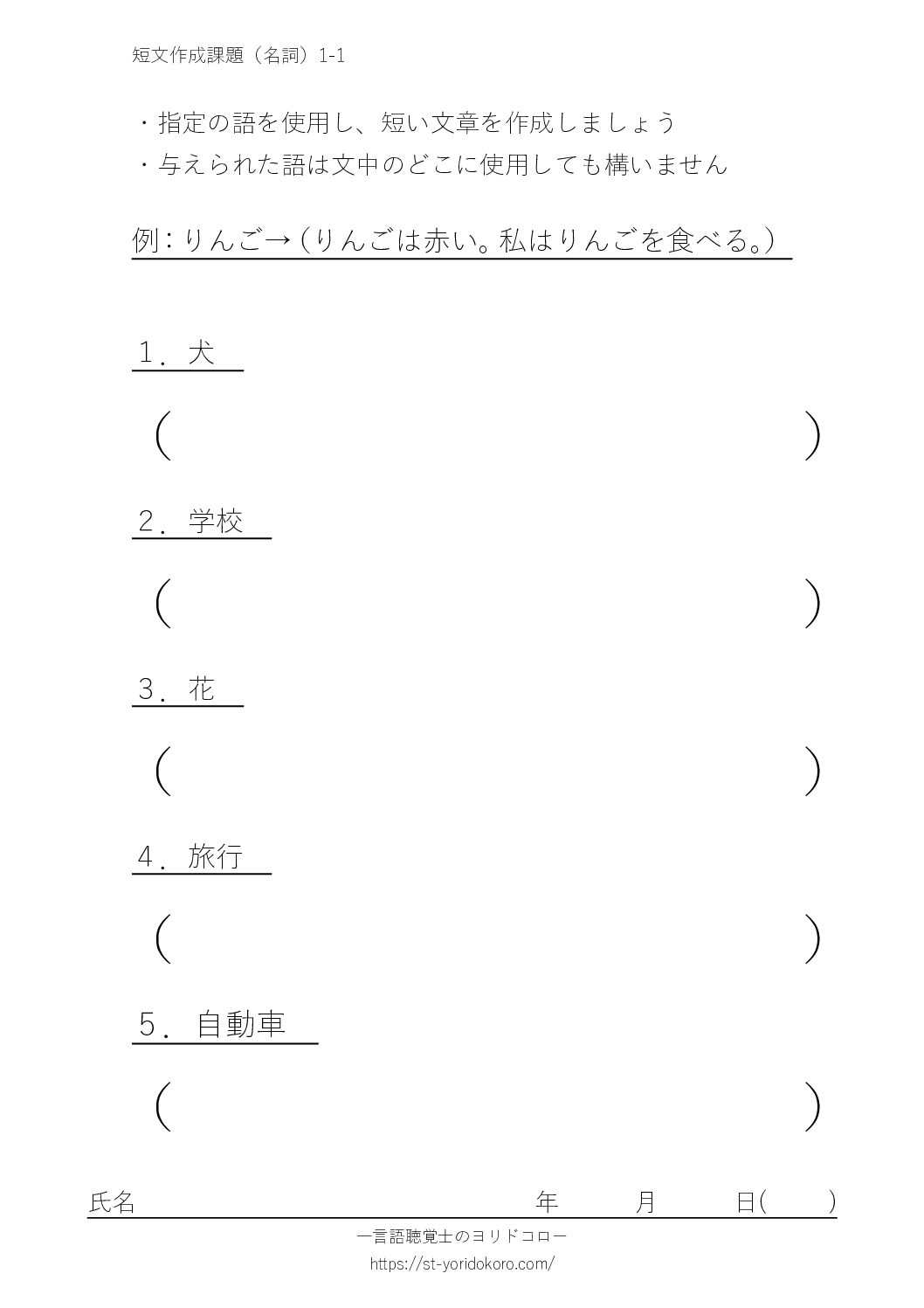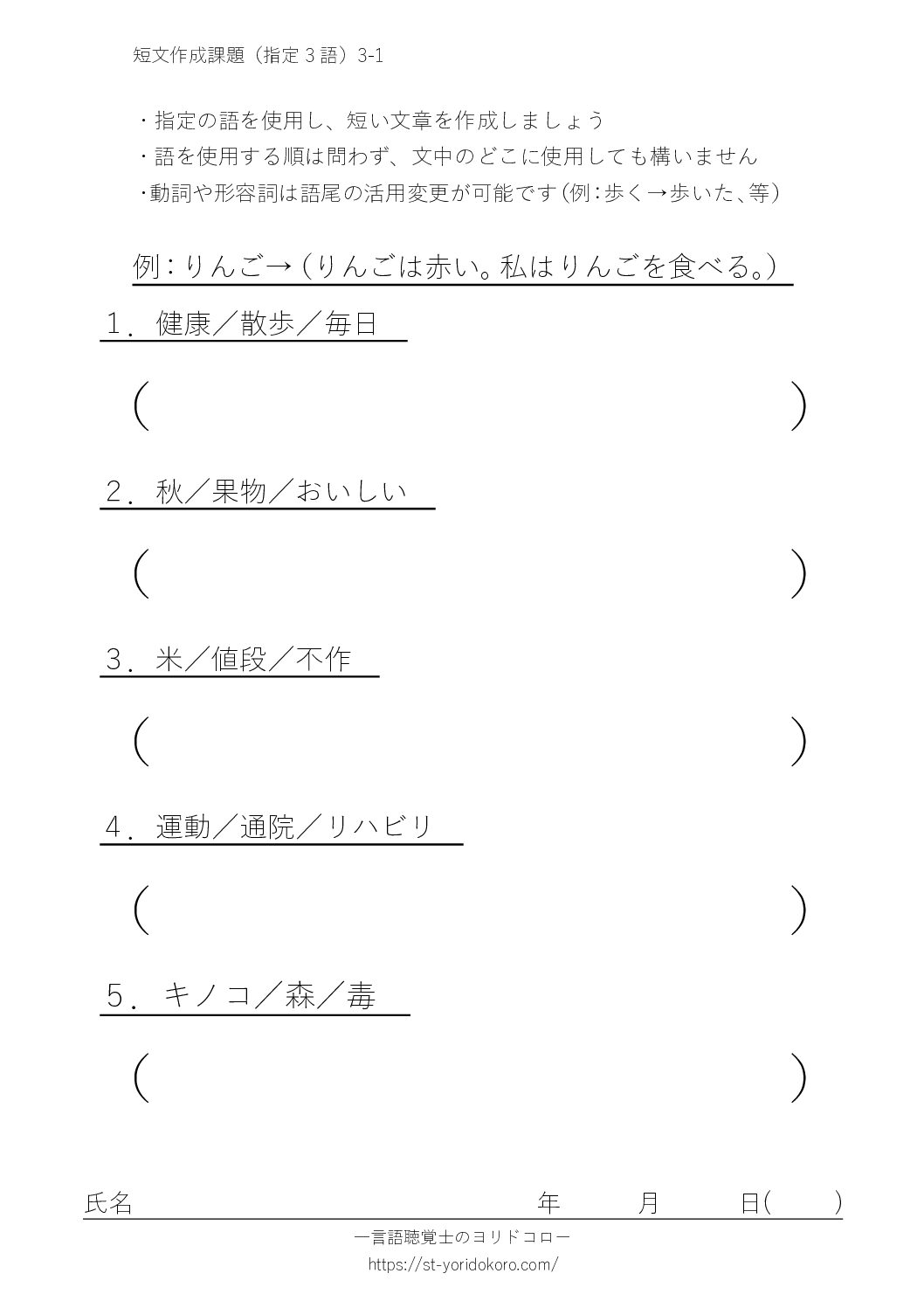 失語症課題 短文作成課題(指定の1語を使用) 【失語症無料プリント】短文作成課題。構文・統語能力(助詞・語尾活用)の向上や語想起能力向上に。指定された語を使用して自由に短文を作成・書字を行う課題です。 2025.09.24 失語症課題
