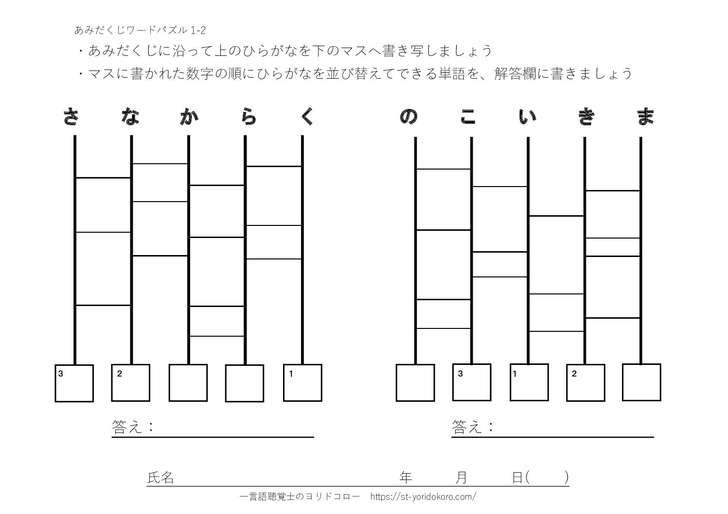 高次脳機能課題 あみだくじワードパズル課題 【無料リハビリプリント配布中!】注意障害、集中力、書字能力、ワーキングメモリーの向上に。上部に並んだひらがなをあみだくじに沿って下のマスへ書き写していき、そのひらがなを数字の順に並べ替えて単語を完成させる課題です。 2025.10.03 高次脳機能課題